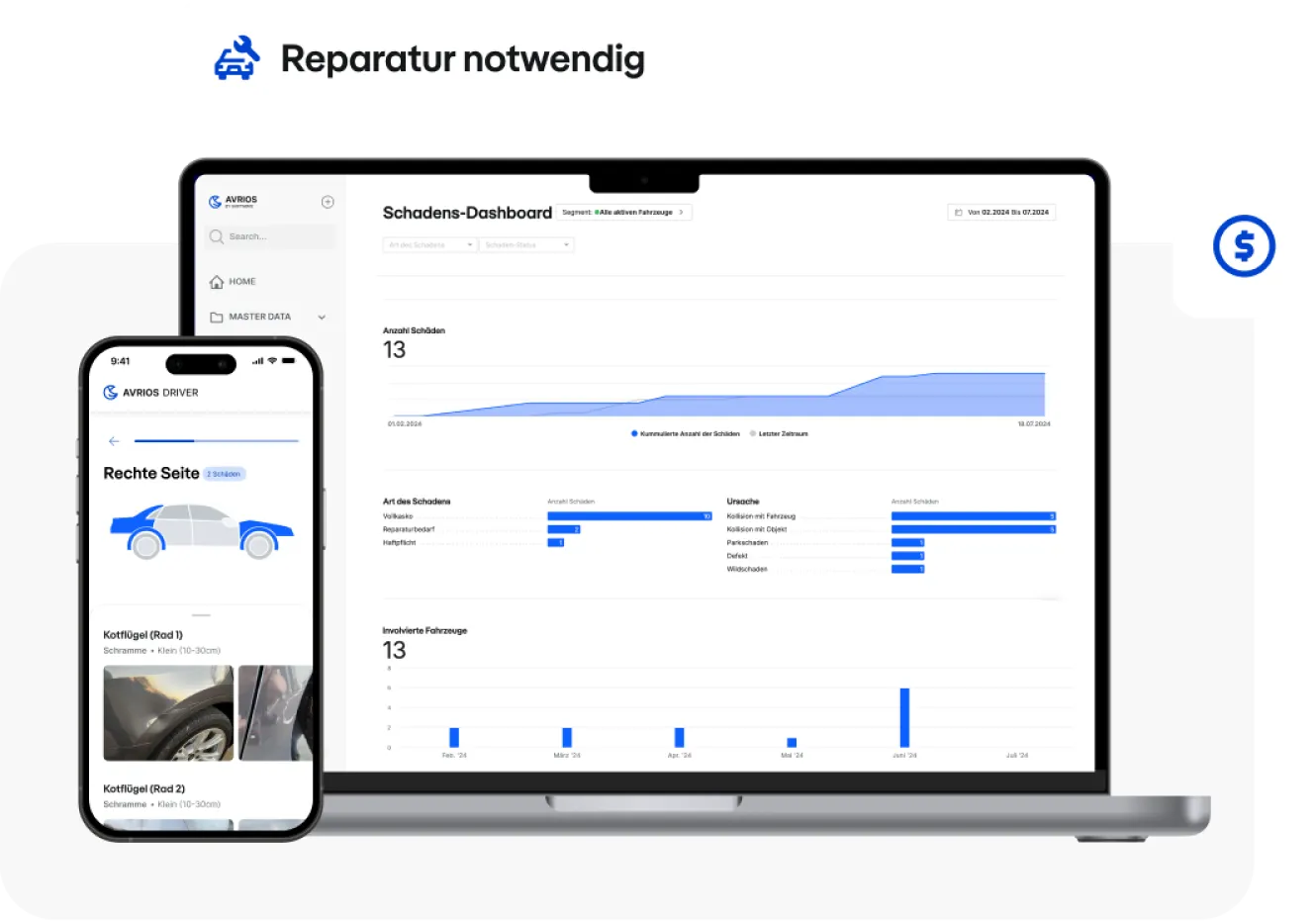 Fahrer reichen Schäden direkt ein, während Flottenmanager sofort einen detaillierten Überblick erhalten. Die Reparaturdokumentation wird zentral in der digitalen Schadenakte gespeichert und ist jederzeit abrufbar.